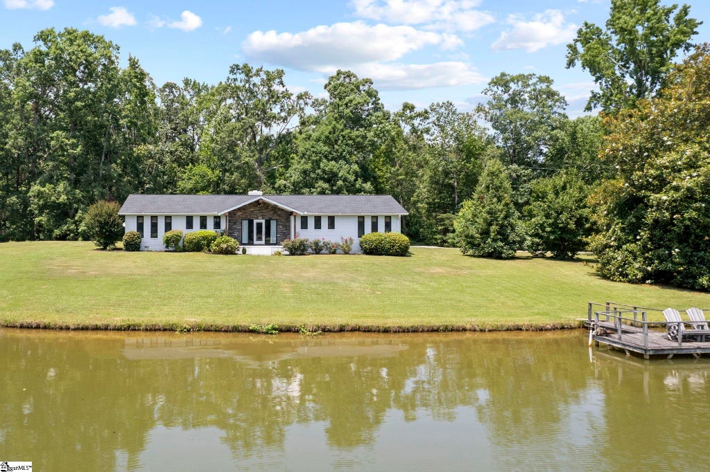 This lovely home is situated on over 11 acres overlooking your magnificent spring fed POND. The views from every room of the home are stunning! You can enjoy fishing in the pond, paddle boarding or just relaxing on the dock overlooking the pond , enjoying the quietness and peacefulness this property has to offer. The tranquility of this setting offers is unmatched! The home features 3 bedrooms 2 baths all one level with the great room featuring cathedral ceiling, built ins, and fireplace with gas logs. There is an office with built in shelving, a walk in laundry room with sink and additional room that could be used as exercise area, home school, or craft room. In this last couple of years this home has many updates to include, new roof, new HVAC, exterior and interior painting, new flooring and updates to both bathrooms. On the property you will find a 30x60 garage/building with electricity and water. On the 11 acres there is a potential for multigenerational opportunities for Building site. The house is located in beautiful Southern Greenville County, but close proximity to the Southern Connector and 85 corridors for commute ease to Greenville, Anderson, or Spartanburg areas